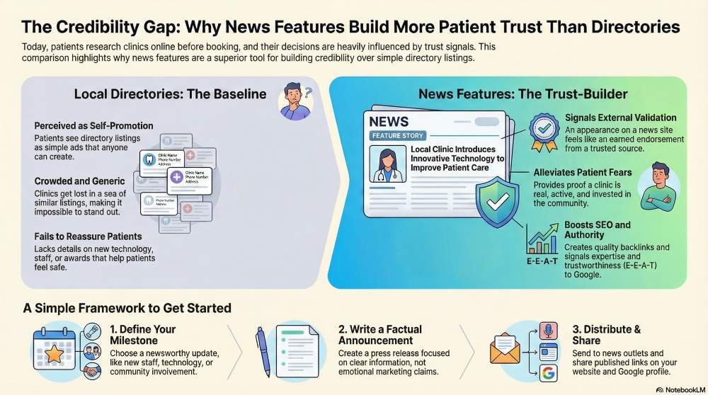 Directories are still useful, but they are not differentiators. Press releases for small clinics turn invisible progress into visible credibility. They help patients feel safer when choosing care.
